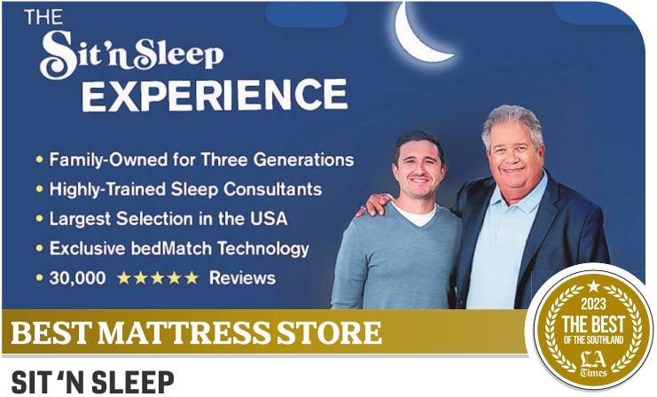 Sit ‘n Sleep is a family-owned mattress retailer that has been serving Southern California for more than 40 years. We have 36 stores across Southern California and are known for the largest selection of mattresses, the most highly trained sleep consultants and exclusive Bedmatch technology that scientifically recommends the right mattress for you. 3853 Overland Ave., Culver City 90232 (310) 801-3987 sitnsleep.com Regional Best for All Regions See also