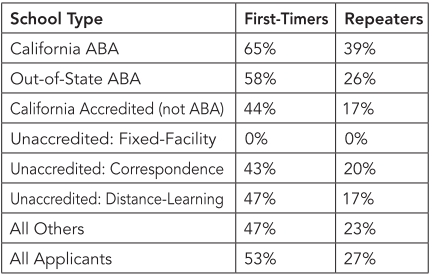 Pass rate for the General Bar Exam (rounded to whole numbers) by law school type: