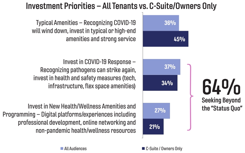 • Nearly 2/3 of tenants (64%) believe owners and operators should make additional space investments in either health and safety infrastructure and technology to potentially mitigate future health emergencies or wellness amenities, programming and platforms that support tenants’ efforts to increase organizational culture, connectivity, productivity and well-being.