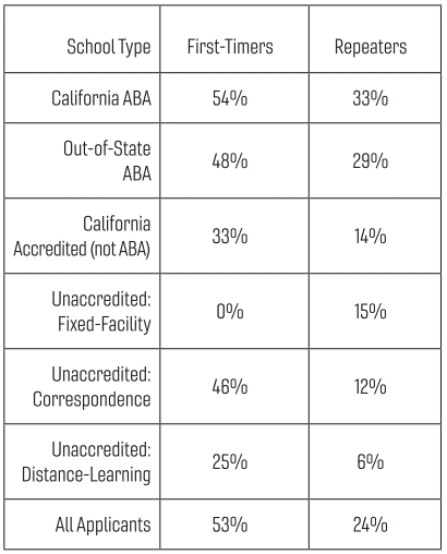 Pass rate for the General Bar Exam (rounded to whole numbers) by law school type:
