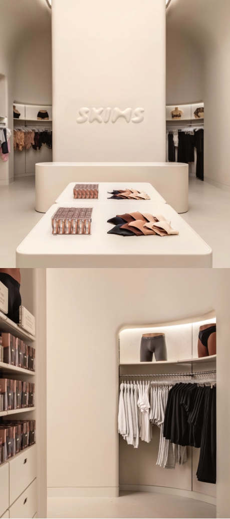 The space aims to create an immersive brand environment consistent with SKIMS’ aesthetic. It incorporates signature elements like rounded fixtures, custom mannequins and materials such as Corian and ultrasuede.
