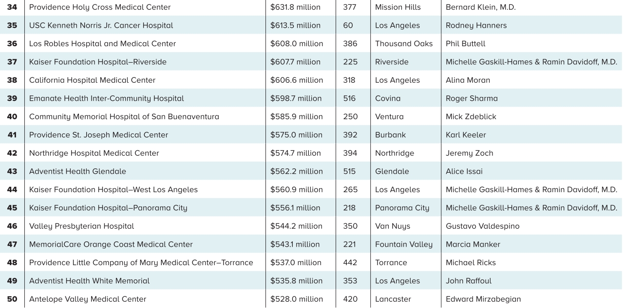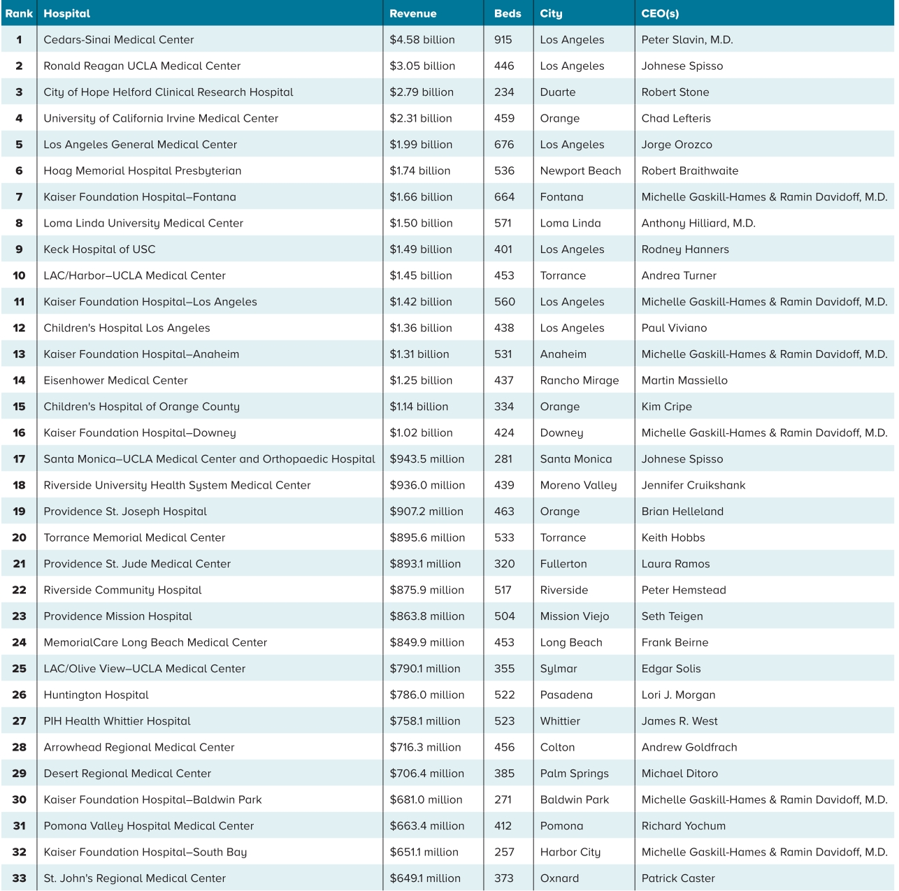 LA Times Studios presents the 50 largest hospitals in Southern California, ranked by net patient revenue. The list includes hospitals located in Los Angeles, Orange, San Bernardino, Riverside and Ventura counties. Data for the list was provided by the California Department of Health Care Services, the state agency that oversees hospitals.