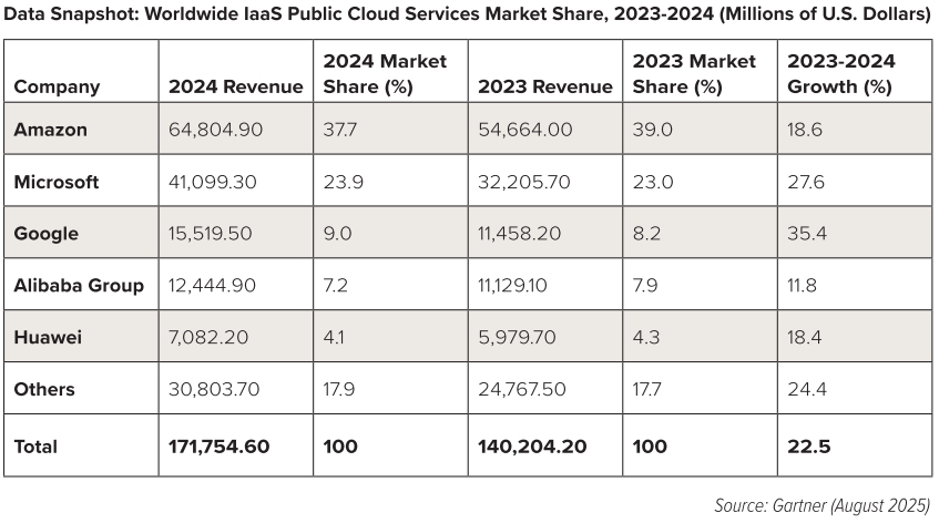 In 2024, the top five IaaS providers accounted for 82.1% of the market. Amazon continued to lead the worldwide IaaS market with revenue of $64.8 billion and 37.7% market share, followed by Microsoft with a 23.9% market share (see Table 1). Google, Alibaba Group and Huawei maintained their respective positions year-over-year.