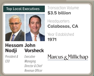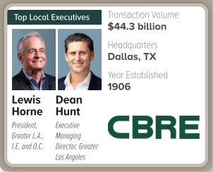 The largest brokerage firms conducted more than $111 billion in Southern California transaction volume in 2024, led by CBRE Group. CBRE employs 500 commercial brokers regionally and has 1,134 total employees spread across seven regional offices. Overall, Southern California’s top brokerages employ more than 2,800 licensed commercial brokers across 130 local offices.