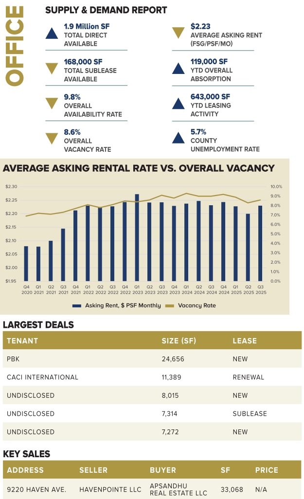 The office vacancy rate in the Inland Empire held steady at 8.6%, which is the lowest of the major Southern California markets. Medical office development is a bright spot in the area, but overall leasing activity has slowed this year compared to the prior year. Affordability is a key driver of the market, but the office tenant base is limited to small and mid-sized local businesses.