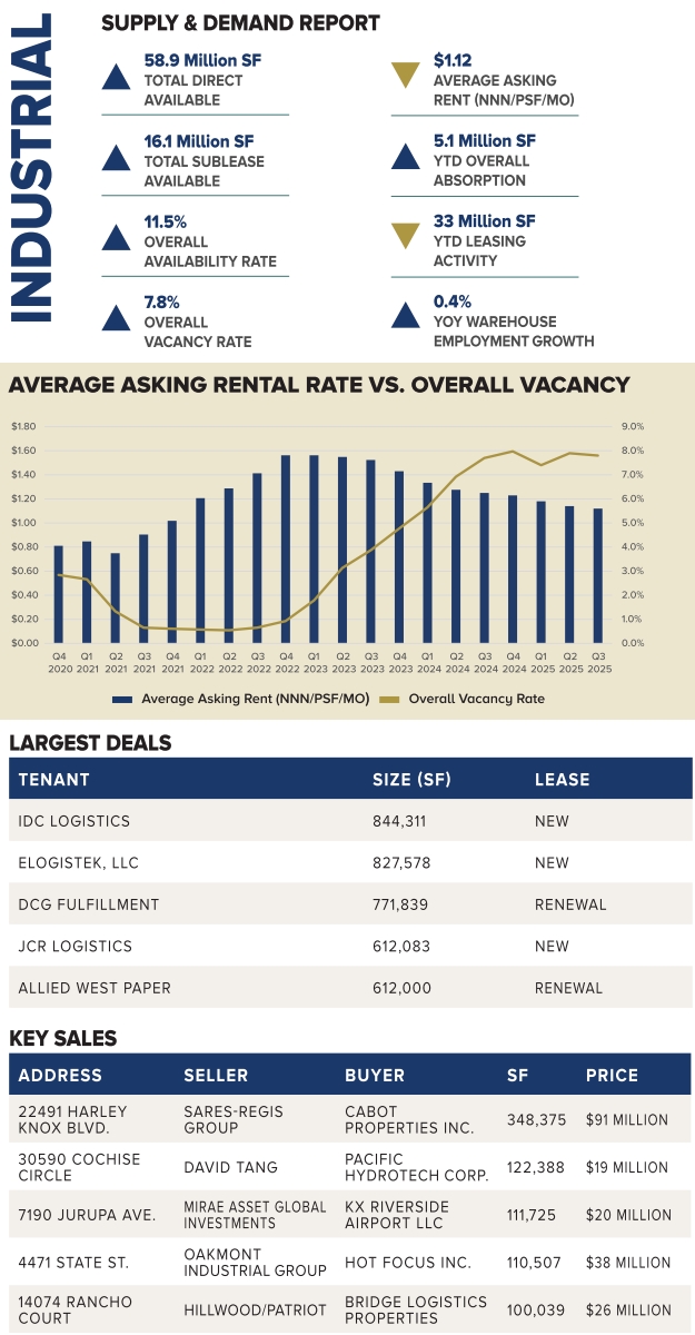 The Inland Empire is primarily an industrial market with about 650 million square feet of warehousing and manufacturing space. The overall vacancy rate climbed to 7.8% even as activity increased. There were 3 million square feet of positive net absorption, although it was outpaced by construction completions that added 4.5 million square feet of vacant space. New construction is limited, with the smallest pipeline in more than a decade. Despite some challenges to market fundamentals from tariffs, high construction costs and high interest rates, the Inland Empire remains among the most active industrial markets in the country.