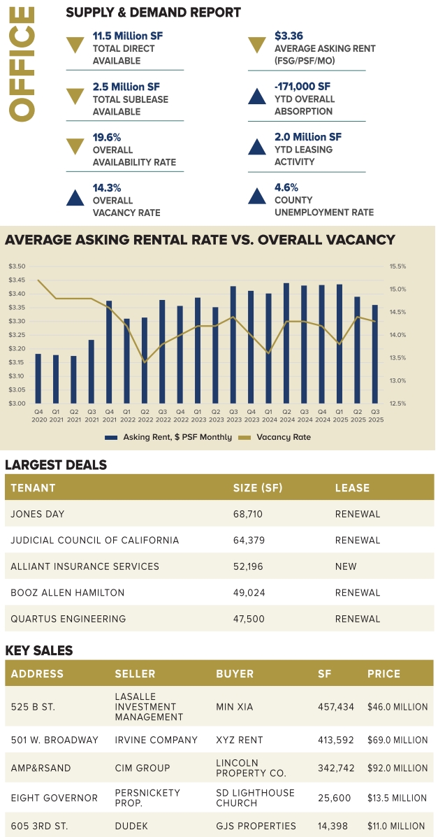 San Diego’s office vacancy rate held steady quarter over quarter at 14.3%, according to data from Cushman & Wakefield.Tenant activity remains strongest for leases below 10,000 square feet as tenants are focused on higher-quality spaces with downsized footprints. Nevertheless, larger tenants were active with the largest lease of the quarter, signed by law firm Jones Day. Technology accounted for the highest percentage of new leasing activity at 23%, followed by government (22%) and legal services.