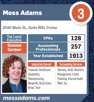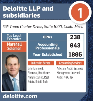 Deloitte isthe largest accounting firm in Orange County with 238 CPAs and more than 1,000 total staff in the area. Ernst & Young LLP ranked No. 2 with 179 CPAs in Orange County and Moss Adams ranked No. 3 with 128 CPAs.