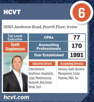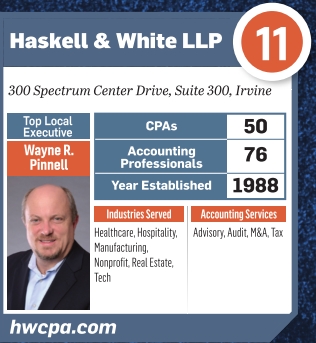 The largest local firm is independent Haskell & White LLP. The Irvine-based firm has 50 CPAs in its local office and a total local staff of 88 employees. The firm has a second office located in San Diego.