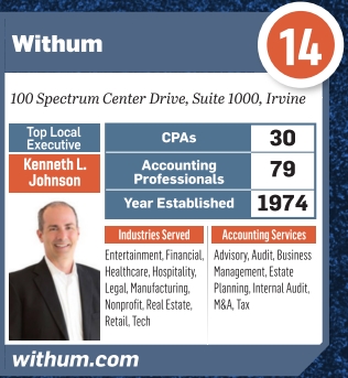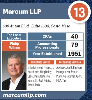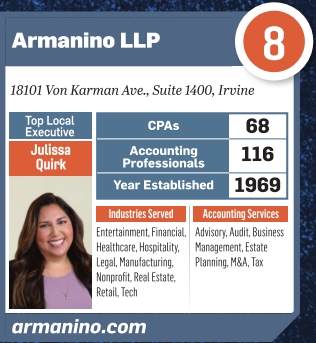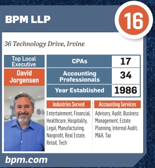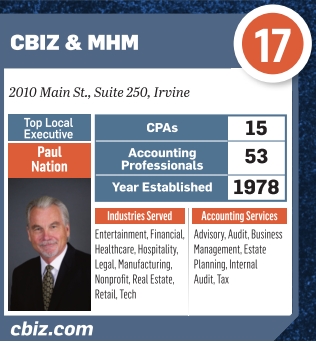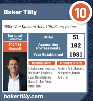 L.A. Times B2B Publishing presents the 20 largest accounting and business advisory firms ranked by the number of CPAs in Orange County offices. Overall, the 20 largest firms employ 1,340 CPAs in Orange County and have more than 4,700 total staff.