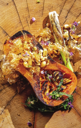Honeynut squash cooked over embers, with Hanaho flower chimichurri and negi.
