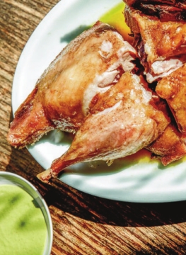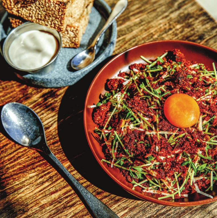 LIEN TA and Jonathan Whitener’s Koreatown restaurant, Here’s Looking at You, could have vanished forever as one of the pandemic’s countless casualties. Its reopening in January after a 17-month hiatus felt like an act of grace to its enthusiasts, me among them. A reductive description like “global small plates plus brainy cocktails” doesn’t convey the improbable combinations that Whitener, who leads the kitchen, and bar director Danny Rubenstein graft with skill and imagination. Sip a mai tai given unexpected depth from house-aged Jamaican rum before disappearing into salt-and-pepper frog’s legs splattered with salsa negra; whipped duck liver swiped with crusty bread and a few drops of smoked maple syrup; and steak tartare channeling Korean galbi, potent with chile and tamari and mellowed with egg yolk. Whitener has an ideal counterpart in pastry chef Thessa Diadem. Her desserts, including chewy chestnut mochi bathed in muscovado caramel and coconut cream, stretch notions of spice and texture without tipping into absurdity. Like most everything at HLAY (as it’s called by nearly everyone who knows the place), these sweet endings come off as unorthodox, sating and perfectly Los Angeles.