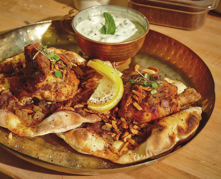 Musakhan, sumac-spiced chicken with onions and flatbread, at Ammatolí. WITH A SOARING, plant-filled extension to her dining room and a remodel of her open kitchen, Dima Habibeh’s Long Beach restaurant feels all the more like a hub of community. In her food, Habibeh — born to a Palestinian father and a Syrian mother and raised in Jordan — embodies her origins and beyond. Pleasantries like a Moroccan spiced salmon salad over arugula dot the menu, but the tradition-minded dishes make Ammatolí a destination. Look for rotisserie chicken over faintly smoky freekeh; handsomely speckled mana’eesh, the flatbread pulled straight from the oven; knafeh, its crust of shredded, orange blossom syrup-soaked pastry giving way to the cheese pull of life; and weekend specials like mansef, lamb shank with spiced yogurt sauce over rice and flatbread. This is arguably the most accomplished classical Levantine cooking in a Southern California restaurant. • 285 E. 3rd St., Long Beach, (562) 435-0808, ammatoli.com See also