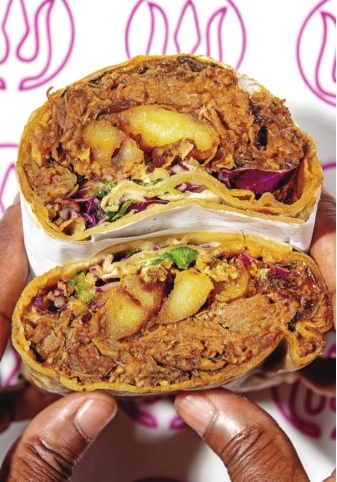 IN 2020, RASHIDA Holmes moved from cooking at restaurants like Botanica and Rustic Canyon to running a pop-up selling roti and other dishes of her Bajan heritage. In a town where Caribbean cuisines often go overlooked in the zeitgeist sightlines, the excellence of her cooking shows many of us what we’ve been missing. Operating on weekends from the Crafted Kitchen commissary in the Arts District, Holmes fills her tidy bundles of roti with her mom’s recipe for chicken curry, a patchwork of sweet potatoes and fried cauliflower or, best of all, soft, ropy hunks of goat meat she buys from Jimenez Family Farms. The crust of her savory patties is improbably delicate, even when bulging with green curry shrimp or shredded oxtail meat with peppers. Start a meal with smashed cucumber salad jolted by jerk seasonings. Sometimes as a special Holmes makes chana doubles — palm-sized rounds of fried bread cradling curried chickpeas with mango relish, cilantro-ginger chutney and other garnishes that pop like flashbulbs. Treat them like tacos from a sidewalk stall; doubles were never meant to wilt in takeout containers.