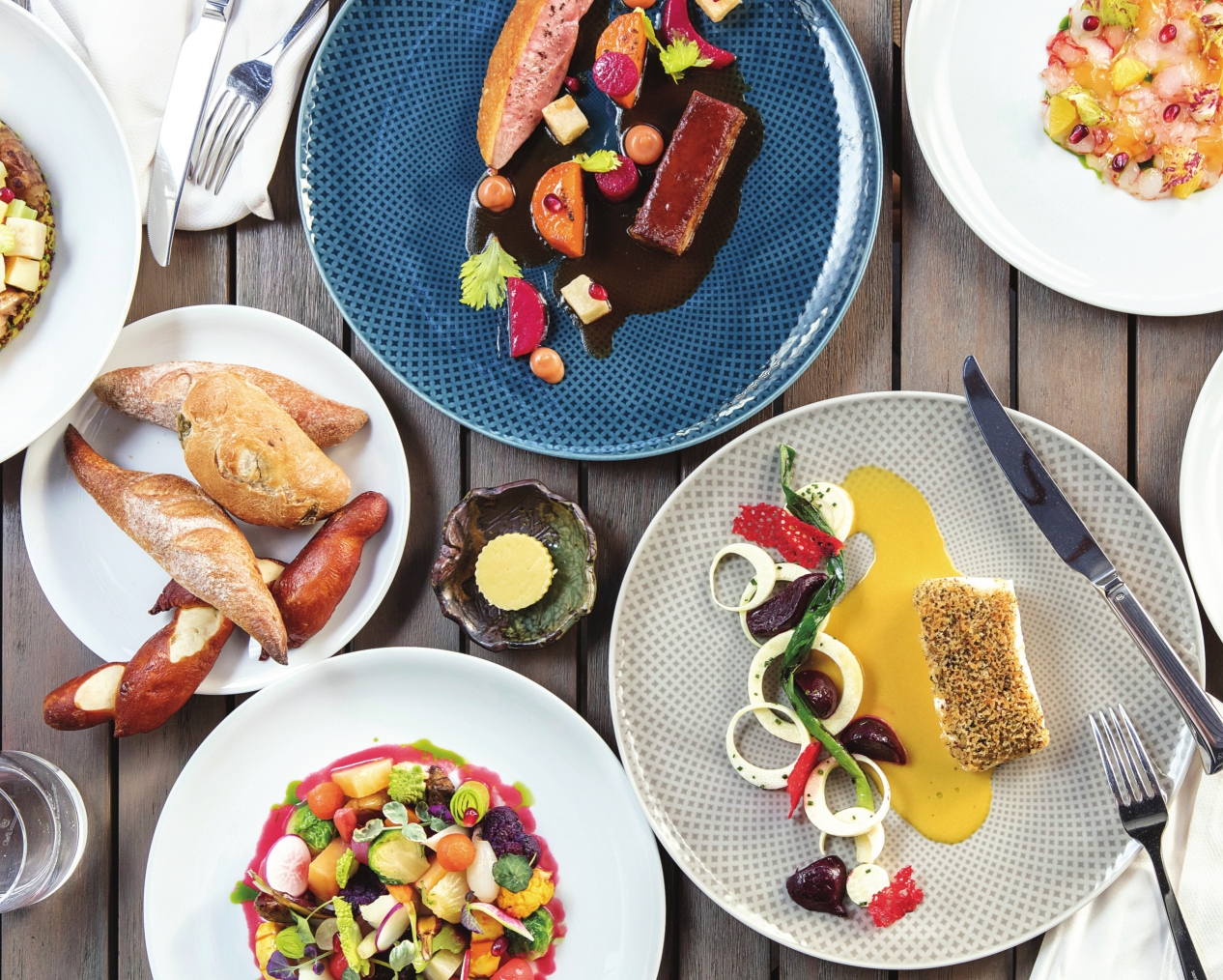 Crescent Farm honey-spiced duck breast and leg confit, clockwise from top center; wild prawn carpaccio; wild Alaskan halibut; legumes de saison; and a selection of bread.