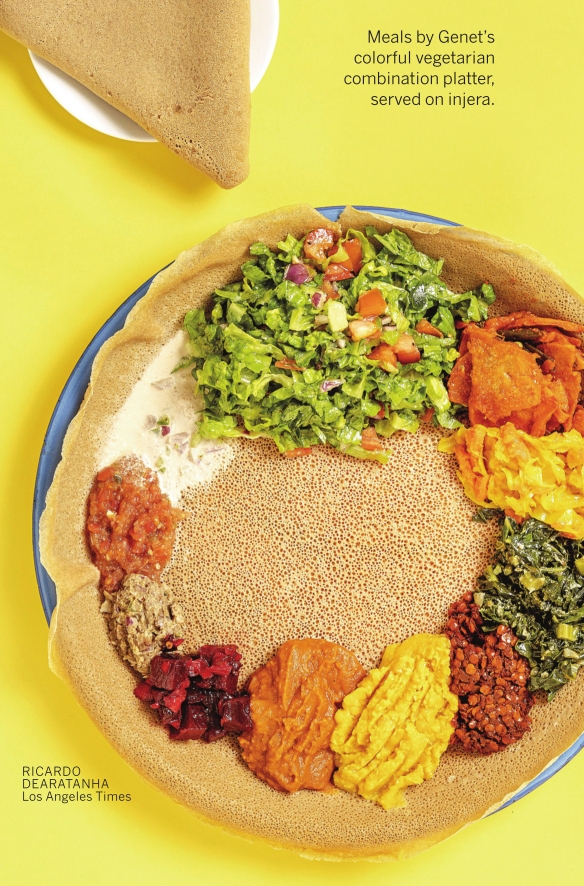 LAST YEAR Genet Agonafer announced her semi-retirement — she’d prepare meals to-go from her Little Ethiopia stalwart Thursday through Sunday, and open her once-bustling dining room only for private events. The decision has meant less cash flow but also less stress for Agonafer. And, as L.A. Times Food General Manager Laurie Ochoa wrote in her selection of Meals by Genet for this year’s Gold Award, “Her customers have adapted as well, grateful that they can still get her cooking through takeout and re-create the shared feast experience in their own homes.” The colors of Agonafer’s vegetarian combination platter, spread over injera, look like an image of California’s shifting geography captured from space: forest-green collards segue to earth tones of spiced lentils and split peas and the soft shades of turmeric-stained cabbage. Lately I’ve been crushing on yebegsisga alitcha, a buttery lamb stew with a mellow thrum of garlic, but let’s never envision a day without Agonafer’s doro wat: She spends two days melting onions and simmering chicken with dusky berbere spices until every flavor fuses into a new, indivisible whole. • 1053 S. Fairfax Ave., Los Angeles, (323) 938-9304, mealsbygenetla.com See also