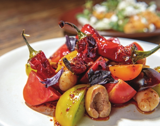 A seasonal dish at A.O.C. features heirloom tomatoes, sweet peppers, beans, Aloreña olives and paprika.