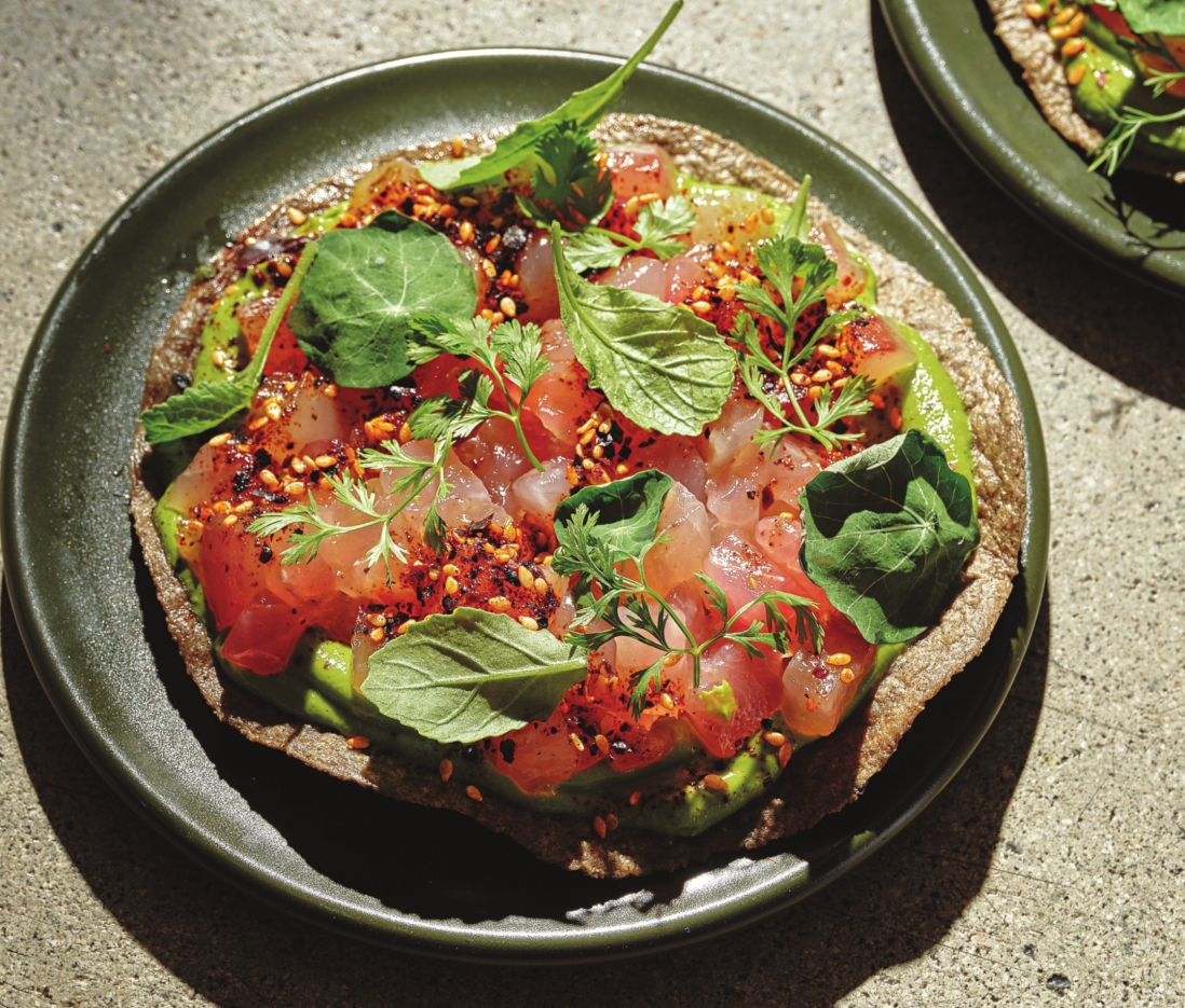 Damian’s fish tartare tostada with avocado, furikake and fresh herbs. DAMIAN BEGAN as Mexico City-based chef Enrique Olvera’s grandly announced entrance to the L.A. market but has settled into a restaurant that feels intentionally engaged with the city, with progressively delicious results. In a region already rich in Mexican food culture, Damian’s leadership team, led by Jesús “Chuy” Cervantes, seems to ask through its cooking: What can we bring to the conversation? Answers come in the forms of a modernist tlayuda tiled with squash and huitlacoche; elegant duck “al pastor” served with caramelized pineapple butter and hand-formed corn tortillas that taste as if they’re made of sunshine; plus a masterpiece centered around a meaty bulb of celery root that has been nixtamalized, baked, then braised in garlic, lemon and butter. At brunch, don’t book a reservation expecting a rundown of egg dishes. Go for pastry chef Josh Ulmer’s crunchy-soft blue corn conchas and the Korean-inspired fried chicken, sheathed in a batter of rice and white corn flours. Housed in a former Arts District warehouse, the interior is mod and moody, though the terrace is especially stunning. Architect Alonso de Garay and designer Micaela de Bernardí have turned the area — amid industrial decay, offset with fresh planters built above winding banquettes — into something exhilarating: part art installation, part urban haven.