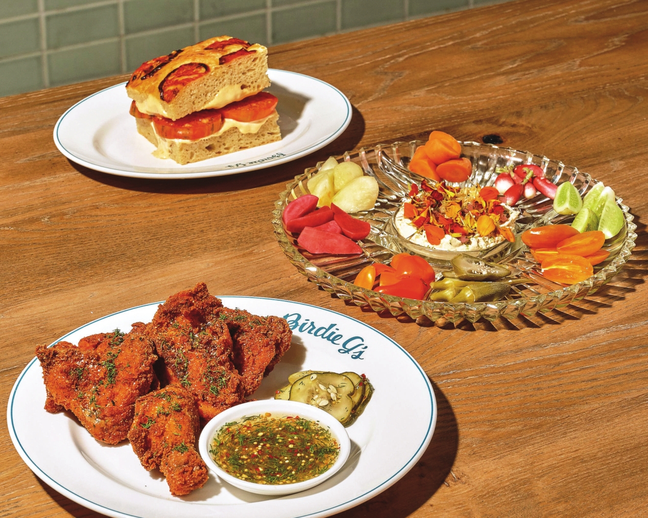 Knife and fork tomato sandwich, top, the relish tray; and “pickle chick” fried chicken. See also