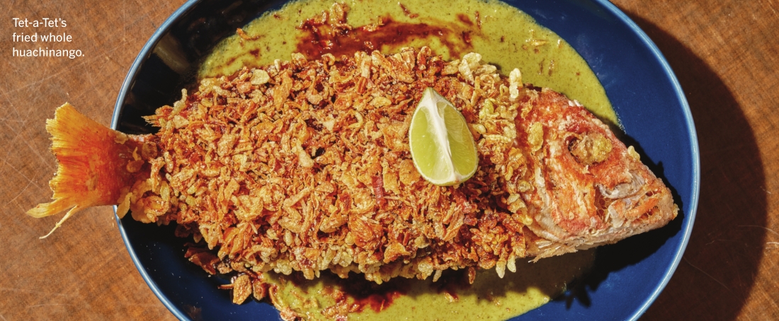 ONE OF THE MOST effective tools that Lien Ta and Jonathan Whitener employ in their arsenal of talents is an element of surprise. Exhibit A: At All Day Baby, their daydream of a corner diner in Silver Lake, they found their approach to breakfast and lunch — biscuits, salads, sandwiches, righteously smoked chicken — wasn’t drawing as fervid an audience at dinnertime. Their solution? In late summer they introduced Tet-a-Tet, a Vietnamese-inspired menu interwoven with occasional Mexican flavors. Chicken liver pâté with lemongrass chile crunch and baguette circles the notion of a deconstructed banh mi; a whole fish is bathed in green curry and fish sauce coconut caramel. Oxtail stew over hominy with pickled jalapeño and salsa macha fits in seamlessly. The dishes have deservedly clicked with customers. During the day, Whitener is crushing it with his loco moco using teriyaki-glazed Spam and breakfast sausage. In an alternate universe, pastry chef Thessa Diadem has the staff and bandwidth to make her marshmallow-capped sweet potato sticky buns every weekend; in this world, keep an eye on Instagram for their infrequent appearance.