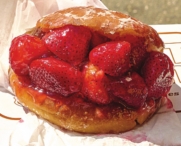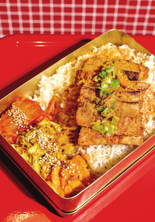 Shiku’s kimchi pork doshirak, top; the Donut Man’s strawberry doughnut. THERE IS NO RUSH of sensation quite like entering the halls of downtown Los Angeles’ 105-year-old landmark, long a juncture of what the city has been, what it is becoming and what we’re hungry for right now. Life cycles play out among its daily throngs. The latest outpost of Broad Street Oyster Co., tidily replicating the warm lobster roll that made the Malibu original famous, replaces Prawn Coastal, the seafood stand run by legendary Campanile co-chef Mark Peel, who died suddenly in 2021. Follow one trail of neon signs for vegan tonkatsu at Ramen Hood, beef panang at Sticky Rice, the Donut Man’s strawberry doughnuts and a lengua taco from Roast to Go (in operation since 1952). Turn nearby corners to find kimchi-braised pork belly at Shiku or a statuesque chicken katsu sando from Moon Rabbit. I have two habitual stops for manna to enjoy later: DTLA Cheese and Kitchen, for whatever the latest pungent rarity Lydia Clarke has in her case, and Nicole Rucker’s peerless Fat + Flour, for a slice of pie mounded with fruit from the best farmers in California. • 317 S. Broadway, Los Angeles, (213) 359-6007, grandcentralmarket.com See also
