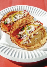 Sample Evil Cooks’ flan taco, above, Cena Vegan’s tacos, Smoke Queen’s barbecue or lobster from Lobsterdamus.