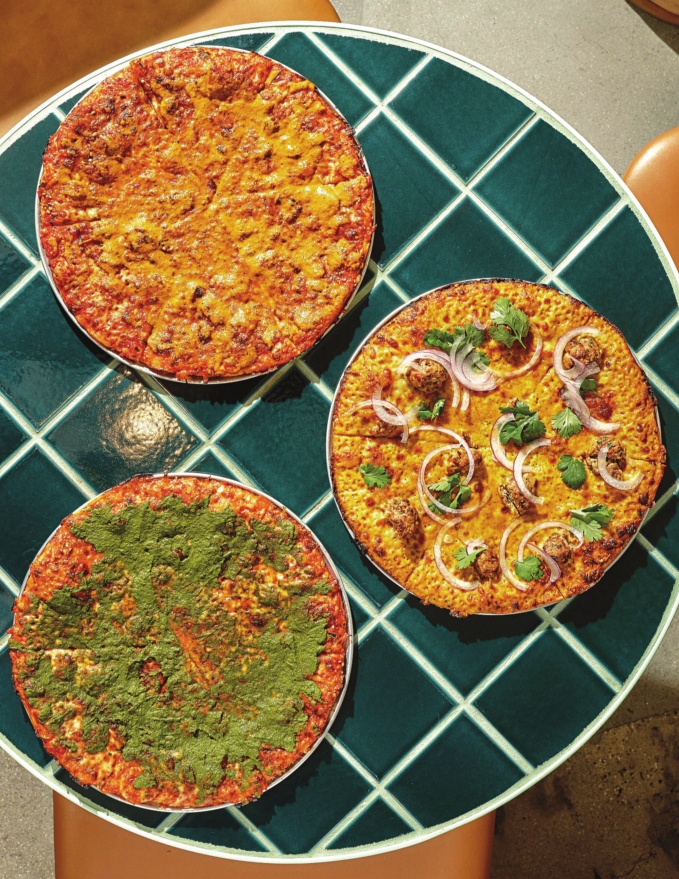 In a room that gives off the air of a businessclass lounge in a Scandinavian airport, surrounded by 13 screens playing whatever game happens to be on that night, you might start with the “green” wings dressed in a cilantro-mint-chive chutney. The early hit is malai rigatoni, its sauce a gentle mixture of cream and tomato masala carrying the reedy twang of coriander seed. Naran and executive chef Miles Shorey do their best to eschew labels, but I’d couch their pies in the vein of East Coast-style bar or tavern pizzas — thin, chewycrisp crusts with plenty of sauce and cheese all the way to their blackened edges. Don’t go too crazy with the build-your-own combinations: A relatively mild vindaloo sauce topped with chicken tikka and tandoori onions is plenty.