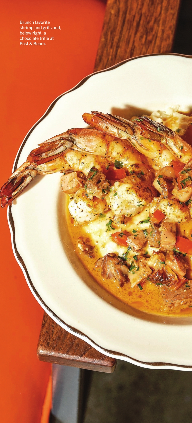 AT THE CROWN-JEWEL restaurant of Baldwin Hills Crenshaw shopping plaza, John and Roni Cleveland serve cheering dishes inflected with the flavors of the American South: shrimp and grits with shrimp butter and beef bacon, jerk catfish over dirty rice, a scarf-it-down grilled cheese rich with braised oxtail meat and smoked mozzarella. For brunch? More oxtail, in the form of hash with poached eggs and mustard hollandaise, and pecanpie-inspired French toast with bourbon caramel. Since its inception in 2011 — when founder Brad Johnson opened the restaurant with L.A. native chef Govind Armstrong leading the kitchen — part of Post & Beam’s mission has been to nurture Black culinary talent. To that end, the Clevelands regularly host Martin Draluck (formerly the restaurant’s chef de cuisine) and his Black Pot Supper Club. The event, inspired by the culinary legacy of enslaved chefs James Hemings and Hercules Posey, builds on the Hemings & Hercules dinners Draluck co-created with Brian Dunsmoor that were featured on the Netflix series “High on the Hog.” The menu might include head cheese or rabbit braised in Madeira, and the table conversations sparked by the historical dishes could be occasionally difficult and very meaningful.