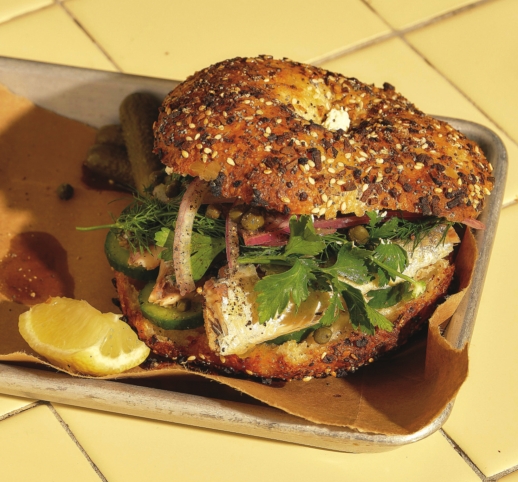 Courage Bagels’ Winter in Sardinia sandwich piles sardines, fresh herbs, capers and lemon on a bagel. I UNDERSTAND that I might be ruining this hack as I type, but I have found the line is shortest at Courage Bagels around 9:15 a.m. on weekdays. The wait to reach the ordering window is often no more than 10 minutes, and usually I can find a seat under an umbrella at one of the tables arranged along the sidewalk. A staffer calls out customers’ names as he rushes through the restaurant’s door; it has no outside handle, so he aims to pass off takeout boxes and dash back inside before the door swings fully shut again. My carton will contain Winter in Sardinia — a sandwich layered with sardines, herbs, lemon and a literal fistful of capers — and also half of a purposely burnt bagel pounded with everything seasoning and draped with smoked salmon. Arielle Skye began selling her compact, smoky-crisp, Montrealinspired bagels from the back of a bicycle nearly six years ago. She expanded to the Silver Lake farmers market, and then in October 2020 she and her now-husband, Chris Moss, moved into the Virgil Village space previously occupied by Super Pan bakery. So Courage Bagels isn’t an overnight success story, but it has blossomed into an undeniable phenomenon. They really are worth the wait, no matter when you show up. • 777 N. Virgil Ave., Los Angeles, couragebagels.com See also