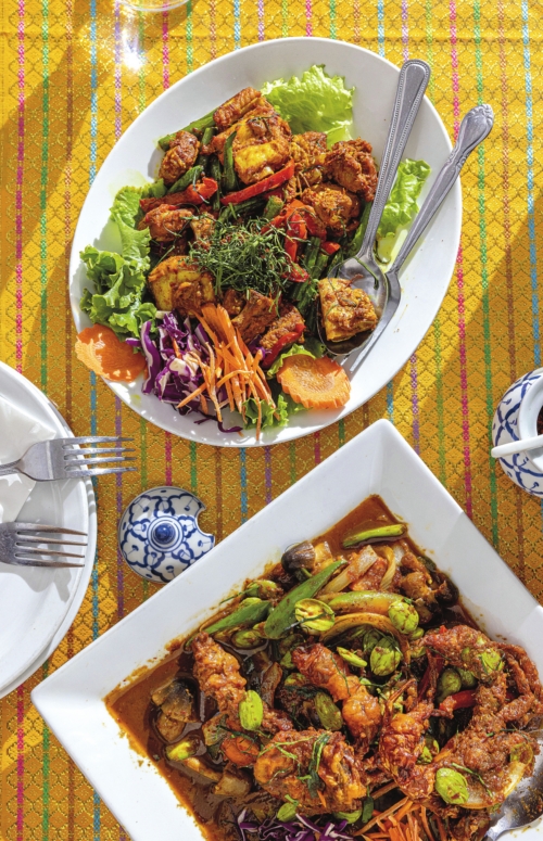 Kua kling sikrong moo (dried pork curry), top; pad phet luuk taw puu nim (deep-fried softshell crab with spicy stir-fried sator beans). FEW MODERN restaurant legends have endured like the story behind Jitlada: Chef Suthiporn “Tui” Sungkamee, who died in 2017, and his sister Sarintip “Jazz” Singsanong took over the long-running restaurant and introduced a then-untranslated back page full of radically spicy Southern Thai specialties. Those dishes have been incorporated into its 10-page English menu for a while now, but their written accessibility doesn’t mean the kitchen has diminished their incandescence. As a masterclass on regional Thai cooking, Jitlada is indispensable. The choices can overwhelm, true, though reconnecting with an old favorite can feel like rediscovering a beloved novel. It happened for me recently after ordering kaeng kung yawt khaam awn, shrimp and young tamarind pods in a soupy curry lit up with turmeric. There were shadings in its fiery, fruity-sour intricacy I’d missed before. I never forget the effect of the herbaceous jungle curry with lamb; it’s so visceral with capsicums that its ingestion borders on supernatural possession.