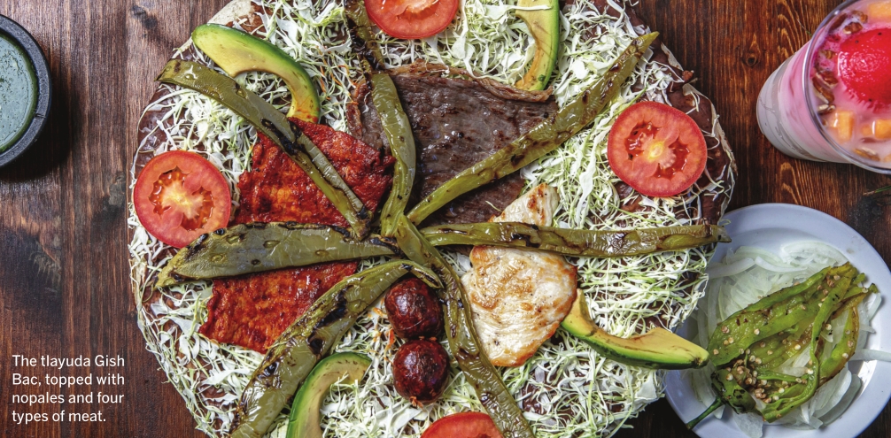 AMONG DOZENS of restaurants that serve absorbing surveys of Oaxaca’s regional specialties, I am continually drawn back to Maria Ramos and David Padilla’s restaurant in Arlington Heights. Ramos comes from a family of barbacoa masters and she honors her heritage in two glorious Oaxacan variations: barbacoa roja, which is goat stained with guajillo chiles and served in its ruddy, head-clearing broth; and barbacoa blanco, a less saucy version of steamed lamb fragrant with oregano and cumin. Come with a group for weekend breakfast and try both of them along with an order of enmoladas dipped in Ramos’ mole negro; the sauce is nearly sentient in its intricate flavors and glossy, determined ooze across the plate. In a town more crowded than ever with excellent tlayudas, Gish Bac’s signature still stands out. It’s a circle of life layered with pureed black beans, shredded cabbage covering half-melted threads of Oaxacan string cheese, grilled steak and chicken, the chile-marinated pork called cecina, avocado, tomato rounds and slivers of nopales arranged like spokes radiating from a wheel’s center. Note: The restaurant is cash only.