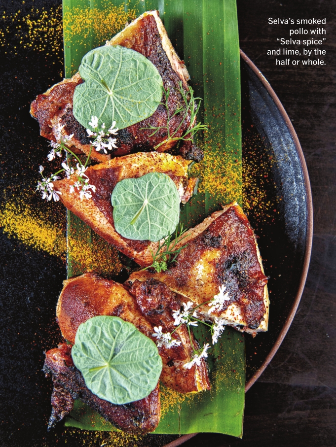 The quickest route to happiness at Selva is via the bandeja paisa, a one-platter feast synonymous with Colombia. Thick, ruddy slices of steak fan across one edge of the plate. A spiral of other meats and sides — grilled chorizo or morcilla, extra-crisp hunks of pork belly, golden lobes of plantain, smoky beans, white rice, a griddled arepa filled with corn and queso, a fried egg, sliced avocado — ends with a tuft of pickled onions arranged in the center like a bull’s-eye. Colombians tend to enjoy their hot dogs, called super-perros, with toppings as layered as geological strata. For Jurado’s joyride version, a link of taut, paprikastained Colombian chorizo peeks out from beneath a topsoil of crumbled cotija, charred onions and peppers, jalapeño jam, aioli mixed with salsa verde (a mulchy, punchy Colombian version called ají) and, finally, smashed Lay’s chips dusted with chile powder. This is, as you might imagine, a two-handed, face-planting commitment to polish off.
