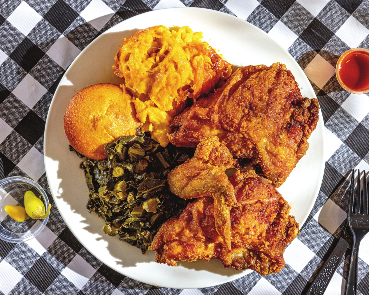 WHEN THE LINE at Dulan’s has inched along enough that I can gaze at the entire topography of the restaurant’s steam table — with its mountains of baked and fried chicken, bogs of greens and foothills of mashed potatoes and black-eyed peas — I’m looking first for the oxtails piled like boulders. They look sturdy, but the long-simmered knobs yield their pot-roast-rich meat at the slightest nudge. Perhaps requesting rice underneath would be wisest for capturing their gravy; I’m far too attached to sides of vinegared collards and mac and cheese. The recipe for the fried chicken, all righteous crunch and saline juice, traces the lineage of Adolf Dulan, who ran the legendary Aunt Kizzy’s Back Porch in Marina del Rey before opening the first Dulan’s in 1999. He moved to Los Angeles from Oklahoma as part of the second wave of the African American Great Migration. Adolf Dulan died in 2017, but the Dulan family honors his culinary legacy. This food is integral to the soul of Los Angeles.