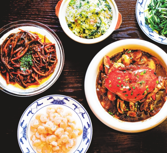 Braised minced eel in brown sauce, left; salty pork and vegetable with rice; crab with Shanghai rice cakes; stir-fried shrimp.