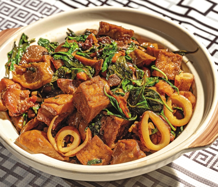 A Taiwanese casserole of chicken, calamari, pork intestines and tofu at Eat Joy Food. THE TAIWANESE MENU at Eat Joy Food is as sprawling as the Pearl Plaza shopping center in Rowland Heights that houses the restaurant. Industry veteran Arthur Chen — who previously ran Cafe Fusion, a family-style Taiwanese restaurant in Arcadia — took over the space in October 2019. To whittle down the choices, ask the staff for direction on seafood specialties, a particular strength of the kitchen. They’ve led me to a three-cup casserole with calamari, drenched in the fragrance of basil; supremely fresh Dungeness crab sautéed with scallions and ginger; and steamed clams suspended in soft custard. I went hunting for a dish I love called o ah jian, a fantastically gooey Taipei classic of oysters, scrambled egg and gel made from sweet potato starch. The search ended happily: It was listed on the English menu as “Taiwanese street food stand oyster pan cake.”