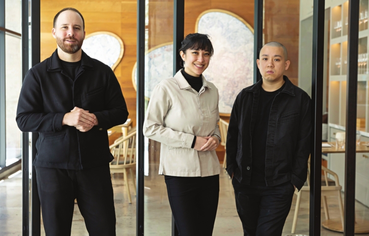 Clockwise from far left, Kato’s Ryan Bailey, Nikki Reginaldo and Jon Yao at the restaurant at Row DTLA; grilled lobster over milk bread toast and peppery black bean sauce, an homage to Newport Seafood’s signature dish; tuna flavored with coriander and chile.