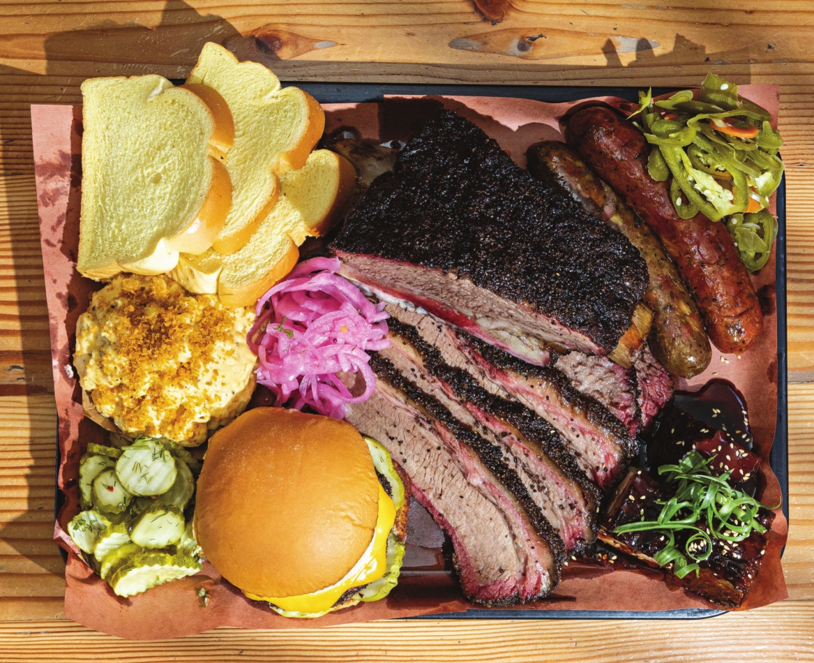 BBQ platter with beef ribs, brisket, sausage, pork belly, a Thicc burger and mac and cheese. It doesn’t matter if you’ve sampled the best barbecue in central Texas, enjoy debating the techniques of pitmasters or have read every Aaron Franklin book. There’s no denying that Moo’s Craft Barbecue is excellent barbecue, with a style that’s distinctly of Los Angeles. I’ve been following Michelle and Andrew Muñoz since they started a pop-up in their East L.A. backyard in 2017. The bark on Andrew’s brisket is as black as night, encrusted in a deluge of pepper. It jiggles like a pop star and has the smoky, meaty punch of good pastrami. His pulled pork is soft and supple, with a winning ratio of fat to meat and a slight vinegar tang. Michelle cleverly infuses a SoCal spirit into snappy sausage links engorged with queso Oaxaca and roasted poblanos, plus pork belly burnt ends sticky with a Korean barbecue-inspired glaze. Most tables at the couple’s Lincoln Heights restaurant overflow with platters of brisket and ribs, but make sure there’s at least one burger in the mix. The jumbo beef patty is tinged with smoke and encased in a black pepper crust with a blanket of American cheese and just the right amount of sliced white onion. — J.H. 2118 N. BROADWAY, LOS ANGELES, (323) 686-4133 l MOOSCRAFTBARBECUE.COM See also