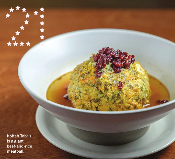 Kofteh Tabrizi is a giant beef-and-rice meatball. Iran’s cuisine historically has had distinct expressions inside and outside the home. Family settings involve dishes that can be exceptionally labor-intensive or stews so nuanced they defy professional kitchen standardization. Most restaurant menus are designed around crowd-pleasing, fire-kissed kebabs, creamy dips and snowdrifts of seasoned rice. Cody Ma and Misha Sesar have poignantly narrowed the divide at their Silver Lake cafe. The star among their concise mix of mazeh (cold small plates), sandwiches and mains is the kofteh Tabrizi, a giant beef-and-rice meatball riddled with herbs and steeped in a tomato-based sauce electric with Persian dried lime. Find its sweet, secret heart: dried apricots, prunes, barberries and walnuts. Look to turmeric-marinated chicken over rice for sheer comfort. In the several years that Azizam ran as a pop-up, Ma and Sesar explored the similarities and differences in their families’ regional recipes. As they settle in, I’m betting we’ll see more intricate khoresht (seasonal stew) specials like a brothy June stunner of lamb neck with apricots. — B.A. 2943 SUNSET BLVD., LOS ANGELES, (323) 928-2286 l AZIZAMLA.COM See also