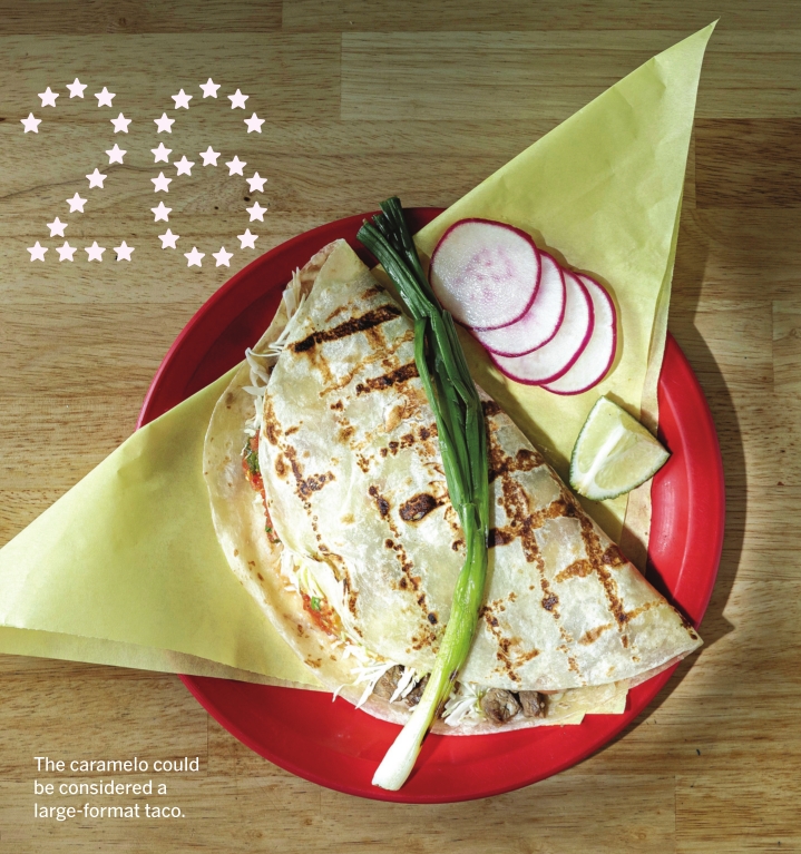 The caramelo could be considered a large-format taco. Jennifer Feltham and Teodoro Díaz-Rodriguez Jr. shifted their phenomenal Sonoran-style taquerias into expansion mode over the last year. Crowds never let up at the tiny eight-year-old original in downtown. This summer, they added a michelada bar at their Mid-City outpost, and in September opened a third location in Long Beach. What hasn’t changed is their attention to quality and consistency. Julia Guerrero ensures the excellence of Sonoratown’s flour tortillas: thin, flaky, durable yet delicate, almost buttery with lard. My order usually involves the famous Burrito 2.0 and at least one chivichanga, a mini-bundle swaddling shredded chicken or beef cooked down with tomatoes, Anaheim chiles and cheese into a dense, gooey guisado. Another prize on the concise menu: the caramelo, a large-format taco that engulfs Monterey Jack, pintos and cabbage for crunch, plus avocado and spicy red salsas. Meat options make for the toughest decision: Classics include costilla (boneless short rib and chuck robed in mesquite smoke), grilled chicken, tripe and chorizo. Cabeza, a new entrant, simmers to such tenderness that the clove-scented molecules transform into beefy custard. — B.A. 5610 SAN VICENTE BLVD., LOS ANGELES, (213) 222-5071 l SONORATOWN.COM See also