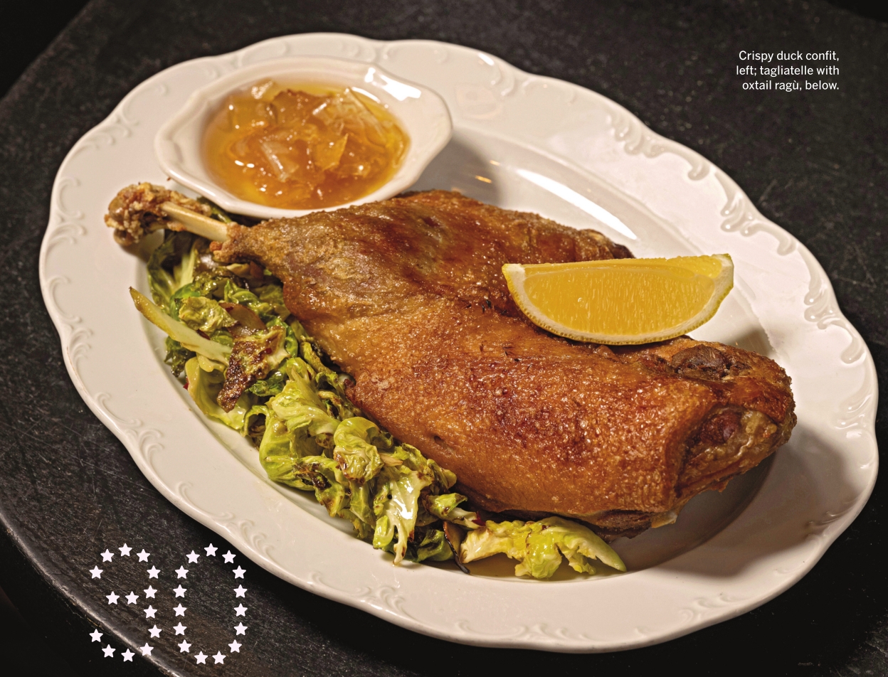 Crispy duck confit, left; tagliatelle with oxtail ragù, below. In spring my partner booked a reservation at Nancy Silverton’s Melrose Avenue flagship to celebrate a colleague’s 20th birthday. I watched this singer take her first-ever bite of the restaurant’s legendary raviolo, her fork cutting the pasta so the yolk in the center ran onto the plate, bleeding into a slick of browned butter. “Oh, wow,” she said, and the muscles on her face stretched into reflexive joy. Mine did too. I was absorbed in my own ricotta-filled pasta — bauletti, parcels tinted green from pureed English peas, pinched into squares and served in lemony broth. Our shared dessert was a handsome bookend to the season: almond-crusted cornetto (an Italian pastry in which the croissant meets brioche) with jeweled roasted cherries and almond gelato. Her delight reminded me how much Osteria Mozza gets right, night after night: consummate service; a wine program that’s biblical in scope and depth; market-dictated salads laced with herbs, followed by an entree like duck confit with rightly acidic pear mostarda. Since opening in 2007, the selection of mozzarellas has illustrated the infinite degrees by which milk can wobble between cream and cheese. Given her status as empire builder and global food ambassador, Silverton entrusts the restaurant group’s culinary director Liz Hong, on-site executive chef Kirby Shaw and their team with the institution’s day-to-day excellence. They keep 17-year-old Mozza relevant in L.A.’s hyperdrive dining culture. — B.A. 6602 MELROSE AVE., LOS ANGELES, (323) 297-0100 l OSTERIAMOZZA.COM See also