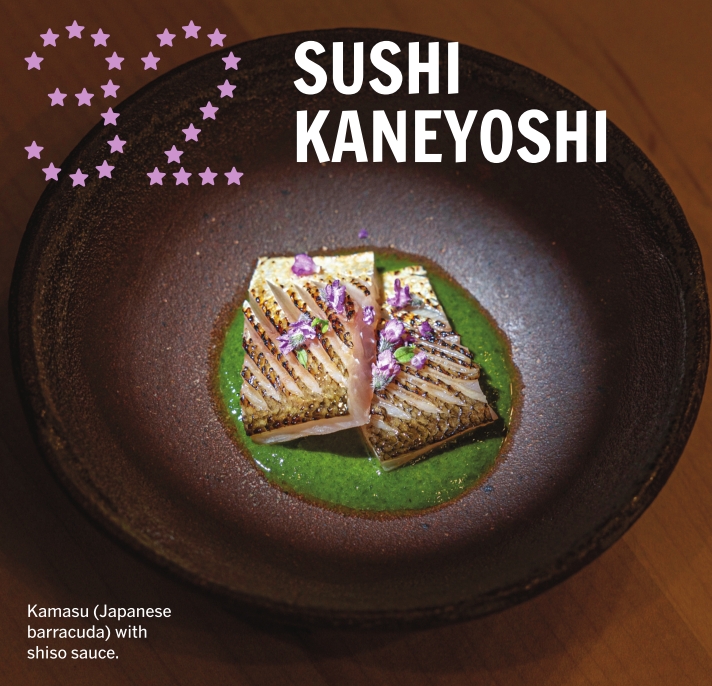 Kamasu (Japanese barracuda) with shiso sauce.Park in the structure adjacent to the 1960s-era Kajima building in Little Tokyo. A security guard will wave you toward an elevator that opens into a basement waiting room. At 7 p.m. sharp, the staff ushers diners to their counter seats in a windowless room lined with at least five shades of polished woods. In a city where omakase is arguably the favored form of fine dining, Sushi Kaneyoshi draws the hardest-to-please connoisseurs. They know Yoshiyuki Inoue will be serving the kinds of fish with seasons that last just two weeks, and that the rice receives equal consideration to the seafood. (I once asked, “Are there times when Yoshi-san flavors his shari differently, depending on the fish he's serving?” The reply that came from Inoue: “We do not change the flavor of the sushi rice. Instead, we prepare the fish in a way that complements the sushi rice.”) Dinners start with appetizers like tempura belt fish beaded with caviar and chawanmushi laced with meat from Hokkaido hairy crab. Then, with showmanship and artistry, Inoue and his assistants launch into a procession of Edomae-inspired nigiri. By the time Inoue looks you in the eye and nods as he places a square of fudgy tamago on your plate, you’re under the master’s spell. — B.A. 250 1ST ST., #B1, LOS ANGELES, (213) 277-2388 l KANEYOSHI.US See also