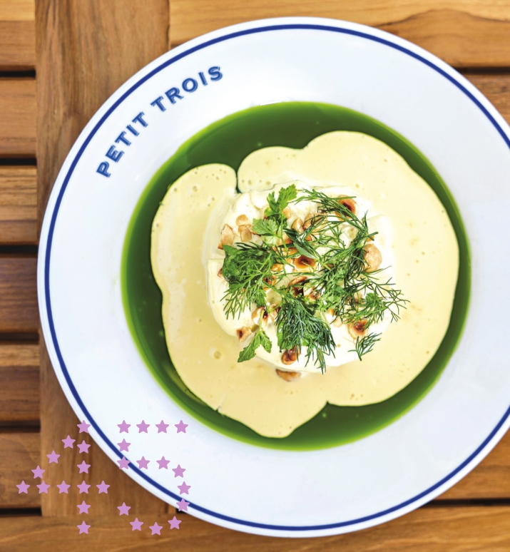 Leeks “fondant” in a sauce vin jaune. The concepts of time, calories and overindulgence do not exist at the Petit Trois marble counter. Ludo Lefebvre created a place of pure excess that operates uninhibited by such conventions. Mounds of blush chicken liver mousse dwarf thick slices of toast shellacked with butter. A stark white sauce au vin jaune cascades over cylinders of leeks, a celebration of the sharp, pungent wine. Lighter but just as lavish is the crab cake supreme, plump and drowning in sweet and salty nuoc mam. Lunch at the counter always seems to stretch lazily into the afternoon, my attention alternating between my plate and the chefs arranging double cheeseburgers in pools of Bordelaise. You can have the burger, crab cakes and the rest at Petit Trois’ spacious Sherman Oaks location, but I prefer the original, where I can pretend I’m in a cramped, impossibly chic Paris bistro in the 6th arrondissement. — J.H. 718 N. HIGHLAND AVE., LOS ANGELES, (323) 468-8916 l PETITTROIS.COM/LORIGINAL See also
