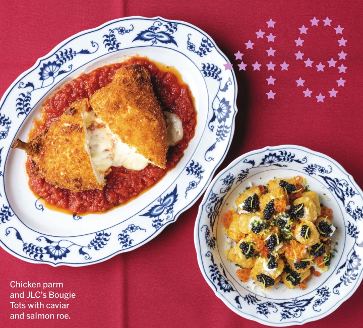 Chicken parm and JLC’s Bougie Tots with caviar and salmon roe. I experience a sort of existential shift every time I part the heavy red curtains of Dear John’s. My eyes widen to acclimate to a darkness so deep it sucks the tension right out of my shoulders. My ears perk up at the sound of ice dancing around a shaker. My body relaxes as it hits the cool leather of the banquette. Within seconds, I’m enveloped in a cocoon of familiarity and calm. Whatever else is happening in the world, my martini, made just the way I like it, is on its way. Here, the perfect creamed spinach exists; chicken parm gets the chicken Kiev treatment, with warm mozzarella that oozes from the center; tater tots are made “bougie” with petite dollops of caviar; and the chopped salad contains an entire deli case of ingredients. I wasn’t around in the early 1960s, when Frank Sinatra and his celebrity pals filled the dining room. But Hans and Patti Röckenwagner and partner Josiah Citrin breathed new life into the space when they saved the building from demolition in 2019. An initial two-year lease has been extended through 2028 and I, like many customers, am happy to delay this Hollywood ending. — J.H. 11208 CULVER BLVD., CULVER CITY, (310) 881-9288 l DEARJOHNSBAR.COM See also