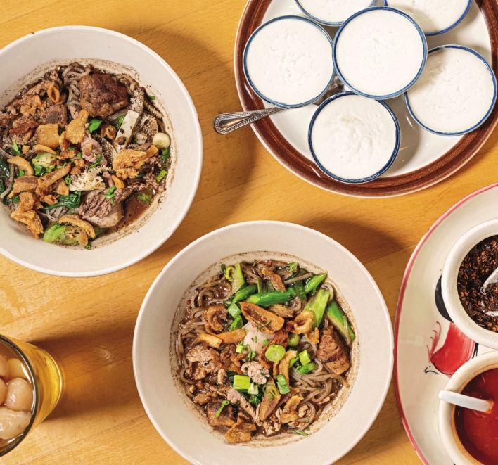 Original Thai boat noodles with pork and beef and kanom tuay (a steamed coconut milk dessert). Malai Data began serving her superlative version of boat noodles — a recipe gleaned from her mother-in-law, who’s made the dish professionally in Bangkok for decades — from a stand in front of Silom Supermarket in Thai Town in late 2022. By year’s end she had a lease for a space two blocks away, in the shopping complex at Hollywood Boulevard and Western Avenue. The short menu, including basil-scented egg rolls and respectable pad see ew, is roundly satisfying, but the boat noodles are the irrefutable star attraction. Data’s servings are small and under $10, as is customary: In Bangkok part of the fun is going from stall to stall, tasting each cook’s tweaks. My order at Mae Malai: thin rice noodles (among five options), as the server recommends; pork over beef; and “spicy” rather than “Thai spicy.” At this level, the chile heat races across the taste buds as a big first sensation and then retreats, balancing the broth’s sweetness and vinegary thwack. Spices like star anise and white pepper glint like fireflies at dusk. Green onions and fried crumbles of pork skin rustle against the teeth, and bites of the bowl’s solo pork meatball bounce around the palate. The noodles feel squiggly, and they’re gone quickly, until only the must-sip liquid dregs remain, tingly and the color of black coffee. Other worthy bowls of boat noodles exist in Los Angeles, but this one rates as a master class. — B.A. 5445 HOLLYWOOD BLVD., SUITE A, LOS ANGELES, (323) 652-2935 l INSTAGRAM.COM/MALAI_NOODLES See also