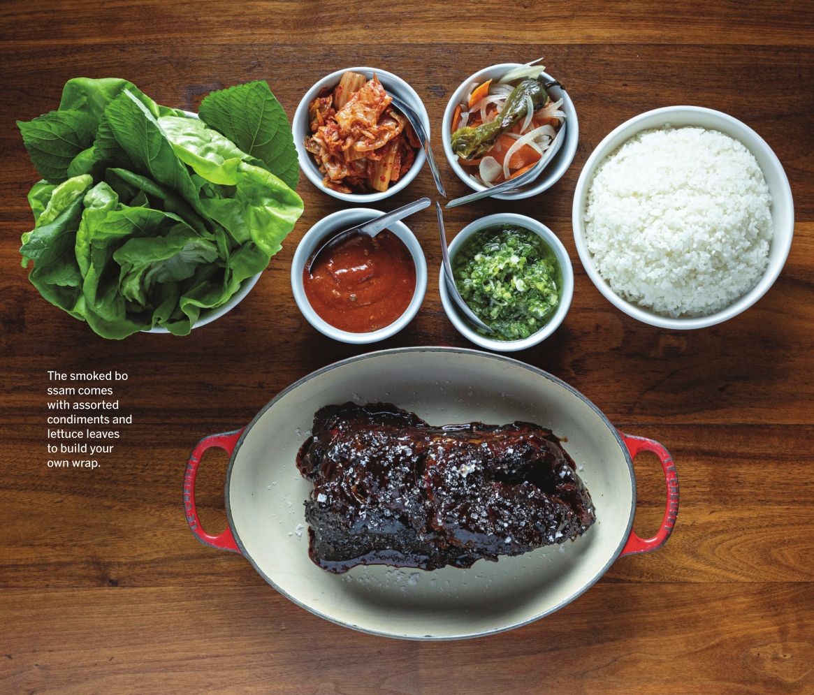 The smoked bo ssam comes with assorted condiments and lettuce leaves to build your own wrap. Majordomo is a no-skip-record of a restaurant. You could blindly point to a spot on the menu and know that whatever arrives will be something you’ll still be thinking about on the drive home. It’s the type of L.A. restaurant that has felt relevant since it opened in 2018, on a hip, industrial stretch in northern Chinatown. The clientele look like they sauntered off the pages of a Copenhagen street fashion blog into its warehouse location. Chef David Chang has figured out the Midas touch for a dining room that’s constantly buzzing. I imagine his celebrity helps, with multiple podcasts and series involving Chang and famous friends. It’s more likely his brazen approach to cooking that launched his Momofuku restaurant group with locations around the country. His smoked bo ssam is a boulder of smoked pork belly you tear at with tongs and stuff into perilla leaves painted with scallion oil, kimchi and ssamjang. The mushroom crispy rice features a crunchy bottom that rivals the best tahdig in town. Dessert is a fiery spectacle, prepared tableside with fried doughnuts, rum flambé and vanilla ice cream. — J.H. 1725 NAUD ST., LOS ANGELES, (323) 545-4880 l MAJORDOMO.LA See also