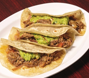 Earlier this year, I described the carne deshebrada with refried beans from the East Los Angeles Asadero Chikali stand for our guide to the 101 Best Tacos in the city. It was the taco I was handed when I asked the taquero to surprise me with his go-to order. It’s still the taco that comes to mind when someone asks for my favorite in all of Los Angeles. The meat is tangled with stewed tomato, onion and peppers. It’s my preferred filling for the exemplary flour tortillas, rolled by hand and cooked on a flat-top until mottled with toasty brown bubbles. They’re buttery, slender and surprisingly sturdy; I could eat a stack on their own. Asadero Chikali (Chikali is the locals-only nickname for the border city of Mexicali) recently opened its first bricks-and-mortar restaurant in a small strip mall in Inglewood, not far from SoFi Stadium. There, the tacos come with a tray of salsas and pickled onions. Though I can’t seem to quit the deshebrada, I always get at least one carne asada “Chikali style,” with the bits of smoky meat served under a dollop of guacamole and beans. And I never leave without a dozen tortillas to go. — J.H. 4233 W. CENTURY BLVD., #7, INGLEWOOD, CA 90304, (323) 396-1563  A trio of the tacos de deshebrada “Chikali style” (with beans and guacamole) on house-made flour tortillas. See also