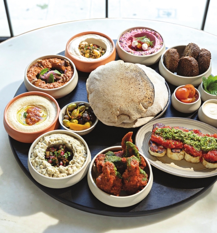 The mezze platter — offering baba ghanouj, falafel, labneh and much more — is an excellent introduction to the Lebanese cooking at Ladyhawk. The mezze platter at Charbel Hayek’s debut restaurant at the Kimpton La Peer Hotel in West Hollywood is the swiftest, most celebratory introduction to the restaurant’s elegant Lebanese cooking. Give the black-lacquered tray a spin, turntable-style, to reach hummus in two variations; baba ghanouj jeweled with pomegranate seeds; muhammara, ruddy with roasted red pepper and walnuts; labneh, its creaminess offset with minced makdous (pickled eggplant); falafel, dark as rich soil on the outside, spring green with herbs on the inside; and cubes of fried potatoes radiating garlicky heat. The feast, which includes hot-from-the-oven Arabic bread and costs $130, presumably is designed for groups to kick off their meal, but I’ve seen couples split it as dinner, with plenty of leftovers for the next day’s lunch. It’s a viable strategy, to which I might only add a clever roast chicken entree. Whipped toum (garlic sauce) and tiny pickles flank the bird. They’re classic flavors in a Lebanese chicken shawarma, deconstructed here for universal appeal — an implied directive in a hotel restaurant — while still shouting out Hayek’s home country. — B.A. 623 N. LA PEER DRIVE, WEST HOLLYWOOD, (213) 296-3036 l LADYHAWKRESTAURANT.COM See also