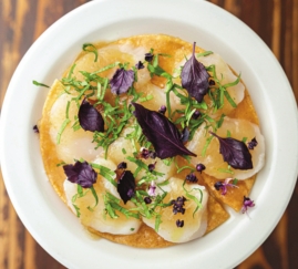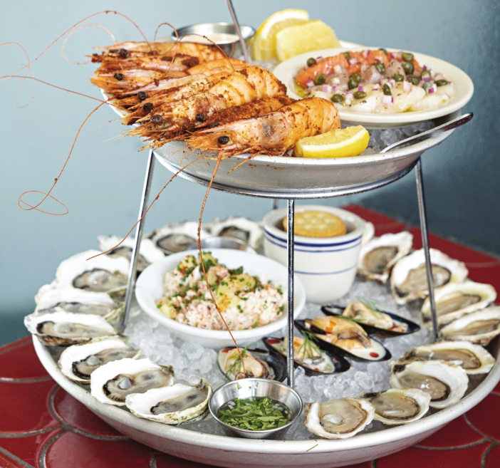 The Overboard Platter, top, features oysters, peel-and-eat prawns, Sicilian crudo and crab cocktail. Above, a scallop tostada. Seafood-centric restaurants with raw bars aren’t quite the anomaly they once were in Los Angeles, but a meal at Ari Kolender’s petite Found Oyster remains unparalleled. Opened just before the pandemic, it’s a narrow slice of New England in East Hollywood, next to a vegan grocery store and just down the street from the Church of Scientology’s big blue building. Parking is rarely easy, and it’s likely there will be a wait for a seat, but a chilled glass of wine helps pass the time and you’ll be handsomely rewarded for your efforts. The seafood platters are grand and inviting, with a lower tier of oysters fanned out on crushed ice with a plate of the day’s crudo in the center. The top layer is crowded with crab cocktail, Ritz crackers and peel-and-eat prawns rubbed with enough spices to stain your fingers red. I make dining companions order their own scallop tostada, greedy for my own bubbly fried shell covered in sweet scallop, tart yuzu and fragrant basil. The lobster bisque roll is as advertised, brimming with chunks of lobster. And I don’t think I’ve ever skipped the wedge salad. But I always make room for a few of the specials scribbled on the chalkboard out front. Fried spot prawn heads with togarashi? A Caesar schnitzel sandwich? Grilled salmon collar with espelette butter? Yes, please. — J.H. 4880 FOUNTAIN AVE., LOS ANGELES, (323) 522-6239 l FOUNDOYSTER.COM See also