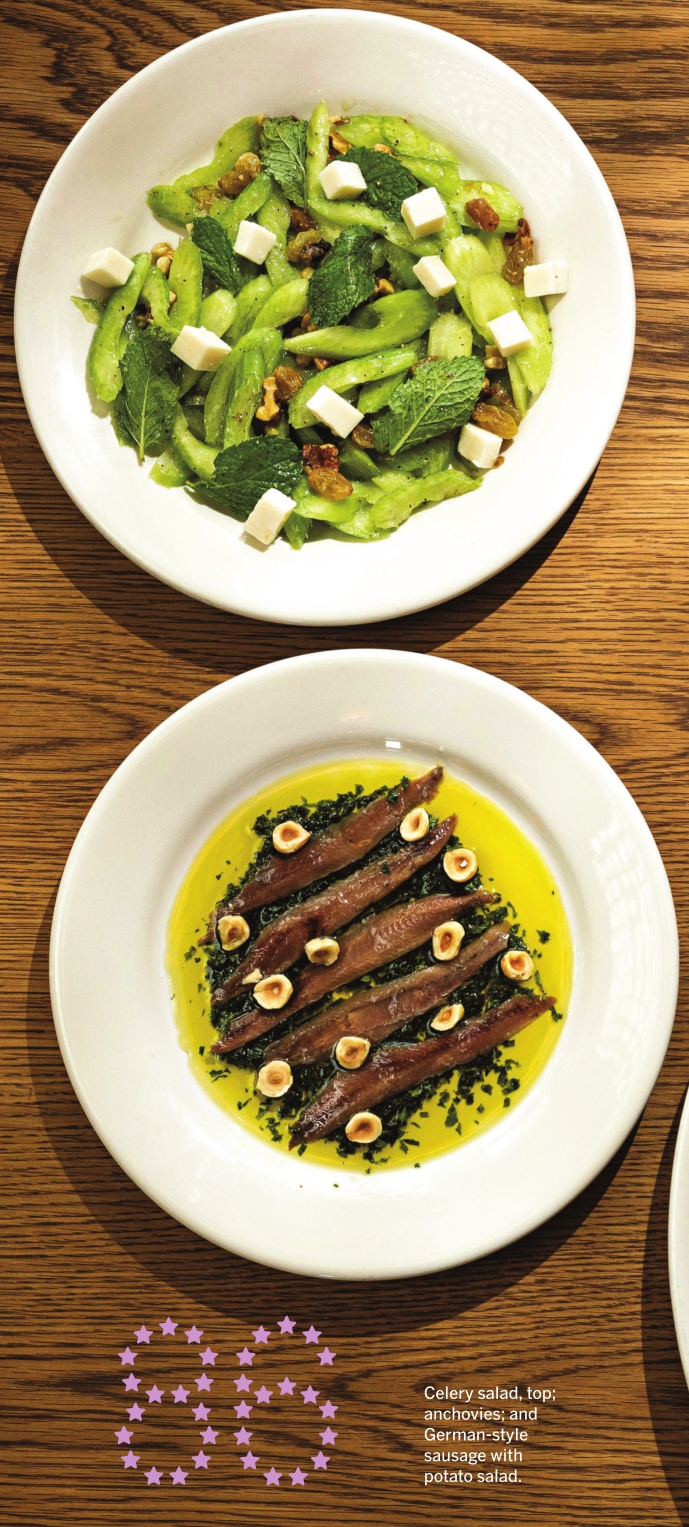 Celery salad, top; anchovies; and German-style sausage with potato salad. The conception of a successful small restaurant — the physical and psychological dimensions, how the experience makes diners feel contained and secure rather than cramped and claustrophobic — is a specific art. Macklin Casnoff, Mackenzie Hoffman and Harley Wertheimer poured their tastes and hospitality know-how into an enveloping 500 square feet along Melrose Avenue that for roughly 30 years housed a coffeehouse of the same name. The result: minimalist space, maximum impact. A warming renovation that serves form and function. A casual, Euro-Californian menu. An incredible wine program led by Hoffman. The kitchen team, under Caroline Leff, keeps a few perennial dishes in rotation. Among them is a celery salad with walnuts, aged Gouda and raisins that nicely pings between sweet and savory, soft and crunchy. As a main course, a link of mildly spiced German-style sausage, sourced from Mattern’s Sausage & Deli in Orange County, is presented with a mound of Japanese-style potato salad creamy from Kewpie mayo and a healthy dollop of mustard. Both dishes are forthrightly delicious, and the kind of untaxing combinations I could eat once a week, alongside a glass of Austrian Zweigelt that pitches cherry right down the middle. That’s precisely the aim. — B.A. 6903 MELROSE AVE., LOS ANGELES l INSTAGRAM.COM/STIRCRAZY.LA See also