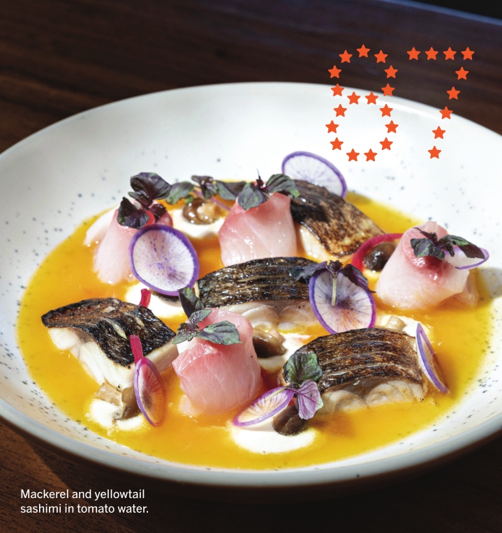 Mackerel and yellowtail sashimi in tomato water. Angelenos are fickle creatures. Restaurants from around the world have attempted moves here, only to find that we’re unfazed by their popularity elsewhere. Mr. T, the two-year-old location of that Paris bistro, has carved a niche in the buzzy Sycamore District. At the bottom of the glass tower that houses Jay-Z’s Roc Nation, smartly dressed patrons flood the patio at breakfast and lunch. An impressive case boasts François Daubinet’s pastries. You can taste the butter in his croissants. A few of the Paris restaurant’s dishes appear at dinner, like the mac and cheese with mimolette flambé set aflame at the table, but chef Alisa Vannah, previously at République, has made the restaurant her own. Vannah’s cooking is a quiet luxury, demure but powerful in its intention and flavors. Mackerel and yellowtail are dressed in a tomato water seasoned like dashi, with bonito, white soy and a shiver of yuzu. Lumpia are plump with chicken and shrimp. Daubinet’s custard is nearly deliquescent, flooded with the tang of passion fruit. Chocolate mousse is rich and fleeting, impossibly smooth before it vanishes on the tongue. — J.H. 953 N. SYCAMORE AVE., LOS ANGELES, (310) 953-4934 l MRTRESTAURANTS.COM
